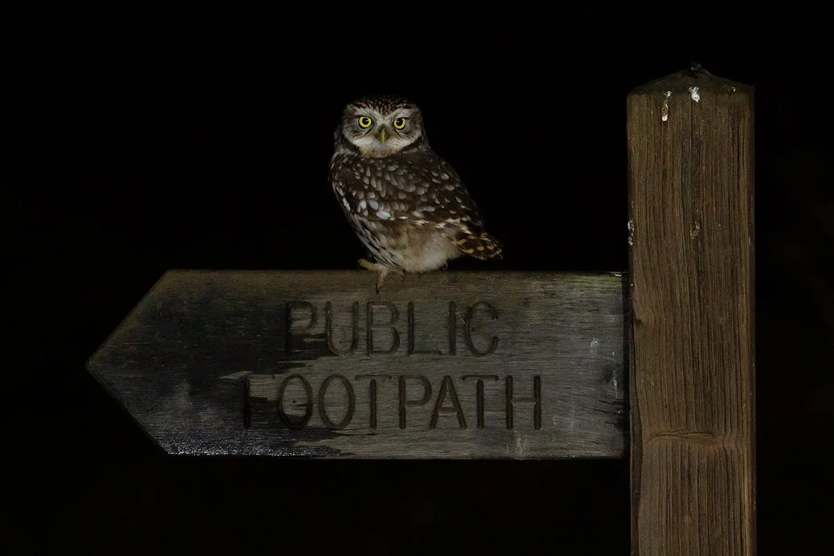 Now it was time for me to settle down and wait! It wasn’t long however until the first visitor arrived in the form of a Little Owl - This guy was in and out all night, on various different perches and gave me ample opportunity to try capture some different images once i had the obligatory portrait shots. I was watching their behaviours to try work out when they were about to take off - they give a slight head bob before launching. I was trying to capture the Owl taking off from the Public Footpath signpost but kept missing! I was either too slow or the Owl went the wrong way or its wing was covering its face etc….Eventually though…BOOM! Nailed it! I was sat there on my own, in the dark, in silence, rubbing my legs like Vic Reeves! (image at top of the blog post)